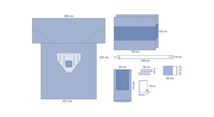 1 Arthroskopie T-Tuch, 221/290 cm x 322 cm, Bilaminat, elastisches Fenster 5 cm, großer Flüssigkeitsauffangbeutel, Armlehnenbezüge