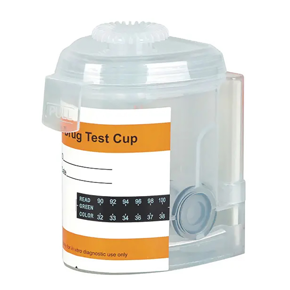 Schnelltest zum Nachweis von 5 verschiedenen Drogen im Urin: Amphetamin, Benzodiazepine, Kokain, Methamphetamin, Cannabis, Barbiturate, Morphin, Phencyclidin. Die objektive Drogenüberwachung im Urinbecher. Handhabung: Der Patient gibt seine Urinprobe in das Schraubgefäß. Der im Deckel befindliche “Schlüssel” verbleibt im Labor. Erst im Labor wird mit Hilfe des Eindrückschlüssels das ventil geöffnet und die Teststreifen reagieren. Die Schutzfolie am Gefäß wird abgezogen und evtl. Drogenrückstände werden angezeigt. Um Manipulationen – z.B. durch Wasserzugabe – zu erschweren, kann am integrierten Thermometer die Einfüll-Temperatur des abgegebenen Urins kontrolliert werden. Jeder Testbecher ist einzeln eingesiegelt. Auswertung nach 3-5 Minuten. Lagerung bei 2-30 °C.