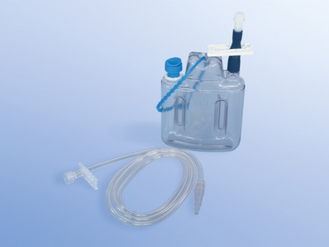 Einmal Redon-Flasche, eckig, als OP-System mit Large-Lock-Konnektor und Stufenkonnektor CH 06-18,