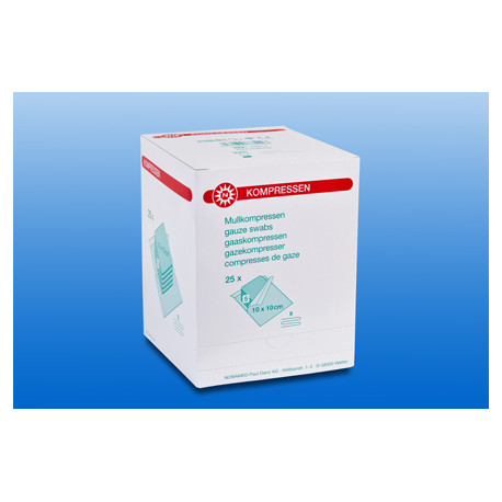 25 Sterilpackungen mit je 5 Mullkompressen sind in einer Packung mit praktischem Entnahmeschlitz abgepackt.