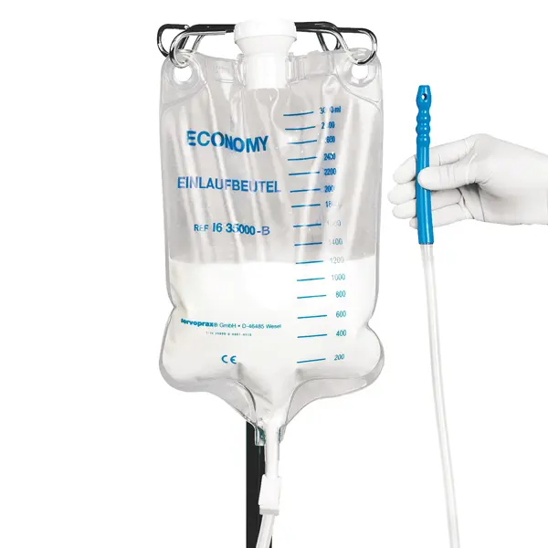 Volumen 3 Liter, mit obenliegender Schraubdeckelöffnung, knickfreier Schlauch mit Klemme, inkl. Darmrohr ø 19 mm.