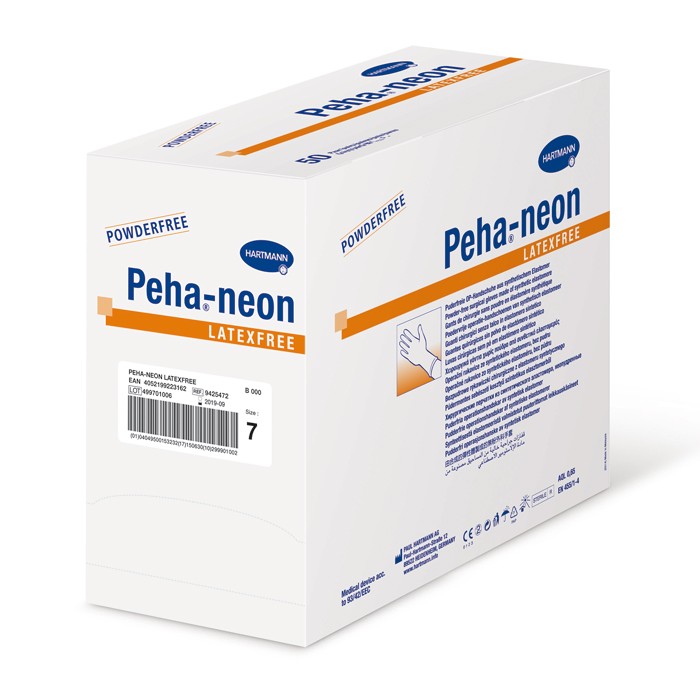 Latex- und puderfreie Einmal-OP-Handschuhe aus synthetischem Polychloropren, durch Polymer-Innenbeschichtung leicht anzuziehen, mit spezieller texturierter Oberfläche für gute Griffigkeit, sehr gutes Tastempfinden, hochelastisch und reißfest, ermüdungsfreier Sitz durch vollanatomische Passform, braun eingefärbt zur Vermeidung von Lichtreflexen. Geeignet für Latexallergiker. Peha-neon latexfree ist ein Medizinprodukt nach EN 455 und Persönliche Schutzausrüstung nach EN 374. Geeignet für den Einsatz mit Zytostatika und Chemikalien. Limitierter Schutz gegen Knochenzement. Er erreicht ein AQL Niveau von 0,65.