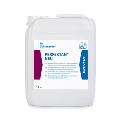 PERFEKTAN NEU ist ein reinigungsstarkes, flüssiges Konzentrat auf Basis von Alkylaminen. Die effziente aldehyd- und phenolfreie Produktformulierung ermöglicht eine materialschonende sowie anwenderfreundliche Instrumentenaufbereitung und vermeidet eine unerwünschte Eiweißfixierung bei der Reinigung. Durch die desinfizierenden Eigenschaften von PERFEKTAN NEU ist bei der Reinigung eine hohe Anwendersicherheit gewährleistet. PERFEKTAN NEU ist ideal zur nicht fixierenden Reinigung von Endoskopen und auch für die Anwendung im Ultraschallbad geeignet.