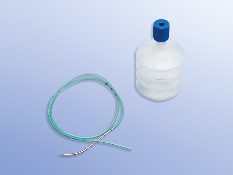 Das Mini-Redon-Faltenbalg-Set besteht aus einem Faltenbalg mit einem Nenninhalt von 20 ml bzw. 40 ml, einem Redon-Drain, Länge 500 mm, mit einer 135 mm Kreuzperforation und einer konnektierten Führungsnadel (Länge 56 mm).