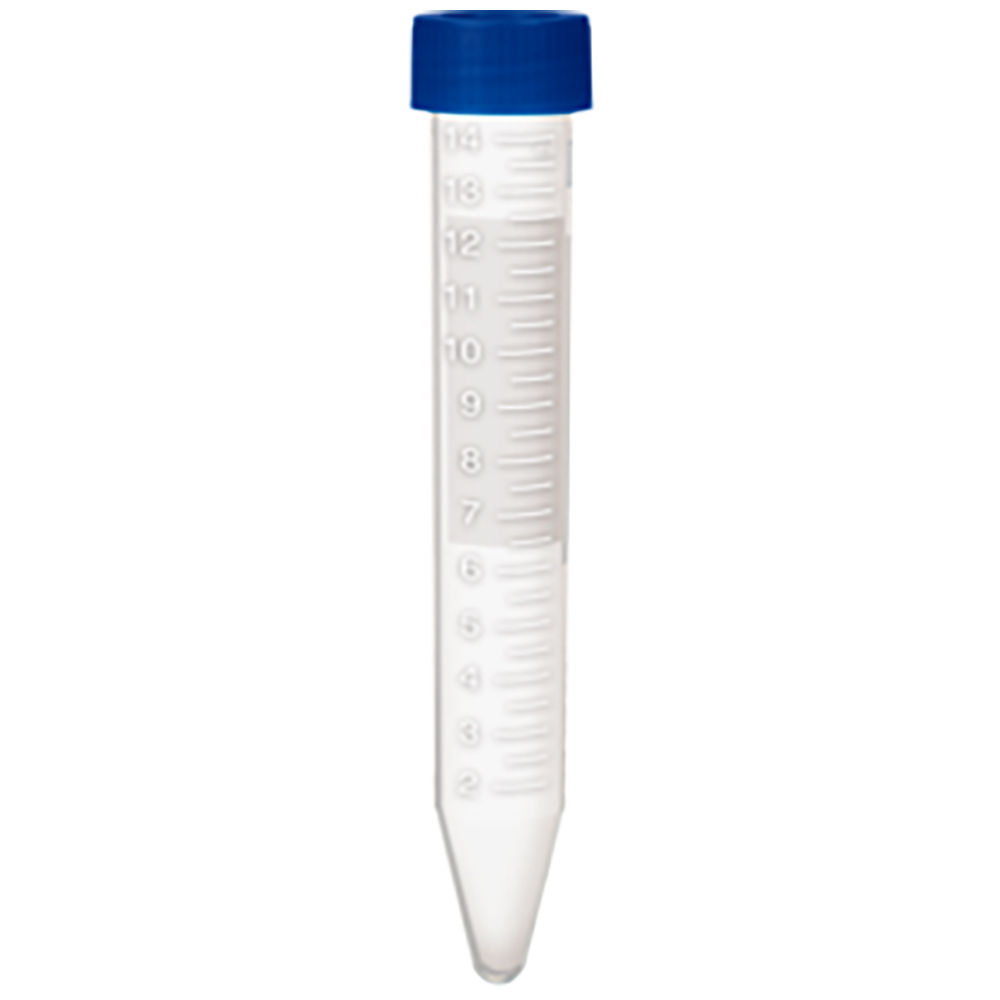 Schraubröhre, Arbeitsvolumen: 15 ml, (LxØ): 120 x 17 mm, Material: PP, Spitzboden, transparent, Schraubverschluss, blau, Verschluss montiert, mit Druck, Etikett/Druck: weiß, mit Skalierung
