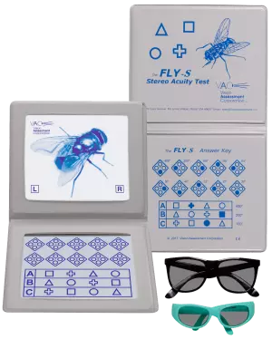 Mit dem Stereotest Fliege-S (The Fly-S) mit geometrischen Formen kann auf einfache Weise das stereoskopische Wahrnehmungsvermögen in jeder Altersstufe getestet werden. Drei verschiedene Tests, die mit der Polarisationsbrille zu betrachten sind, werden im Buchformat angeboten.