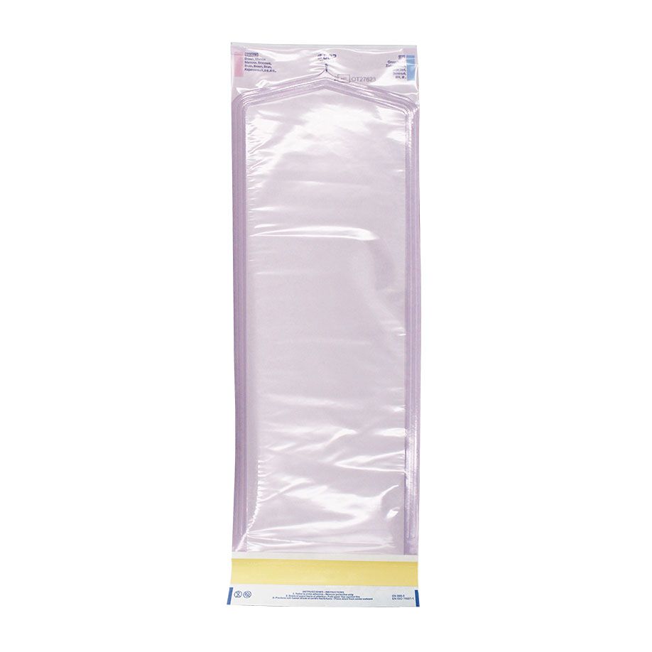 Selbstklebende Klarsichtbeutel mit manuell verschließbarem Selbstklebestreifen (Breite 19 mm) Eingriffsöffnung für leichteres Öffnen durch peelen. Mit Dampf- und EO-Gas-Indikator.